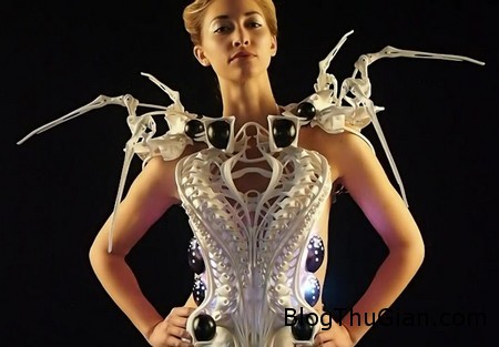 Đó là sản phẩm của nhà thiết kế thời trang và công nghệ người Mỹ gốc Hà Lan Anouk Wipprecht. Chiếc váy cới tên gọi Spider Dress (váy nhện), có thiết kế độc đáo và được tích hợp một vài công nghệ. Theo đó, chiếc váy được tạo ra từ máy in 3D, với thiết kế bên ngoài như những chiếc chân nhện bao phủ lên người mặc.