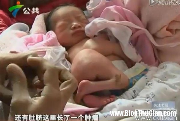 Hình ảnh bé trai tội nghiệp có cặp chân tay thừa mọc trên bụng.