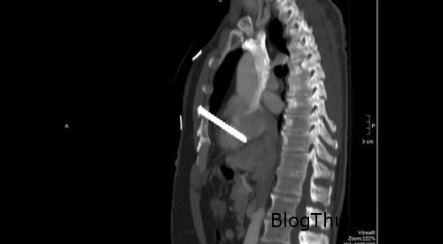 Kết quả chụp X-quang cho thấy chiếc đinh găm đúng vào tim ông Rakow, chỉ cách động mạch vành có 2mm. Ảnh: Youtube