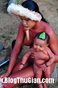 Phụ nữ Zo’é thường địu con mình bằng những chiếc địu được làm từ bông.