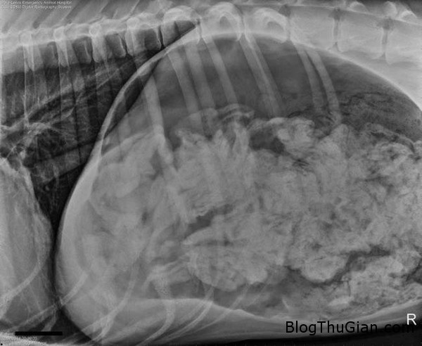 Kết quả chụp X-quang cho thấy, trong dạ dày của chú chó Great Dane có một số lượng dị vật. Các bác sĩ nghi ngờ chú chó này đã ăn tất của chủ nhân khi đói miệng. Phải mất tới hơn 2 tiếng đồng hồ phẫu thuật, họ mới gắp bỏ được tổng cộng 43 chiếc tất ra khỏi dạ dày của con vật. Ngoài ra, các bác sĩ còn tìm thấy 1 vật có hình dáng như gót giày cũng bị nó nuốt phải.