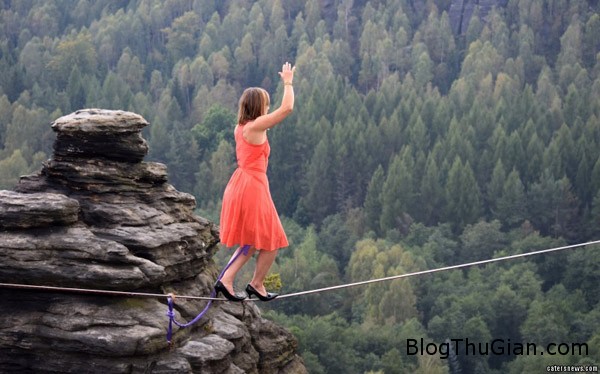Cô gái dũng cảm đi trên dây thừng bằng giầy cao gót