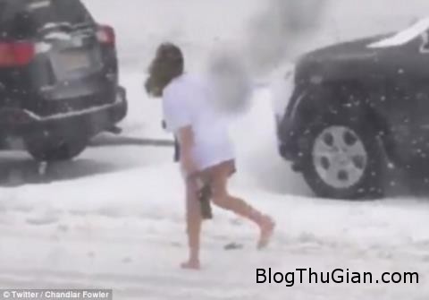 Một đoạn video khiến nhiều người sửng sốt khi một cô gái không mặc quần, đi chân không chạy ra ngoài trời dù đang bão tuyết.
