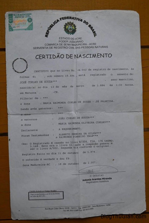 Giấy khai sinh cho thấy cụ ông Joao de Souza Coelho đã bước sang tuổi 131.