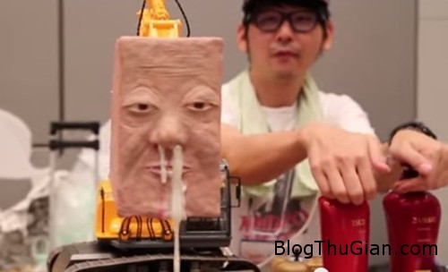 Nó được nối với hai đường ống nhỏ, dẫn đến chai dầu gội đầu và lọ kem xả tóc. Dầu gội đầu và kem xả sẽ chảy ra từ phần mũi của mặt nạ, khiến nhiều người có cảm giác như gội đầu bằng… “nước mũi”