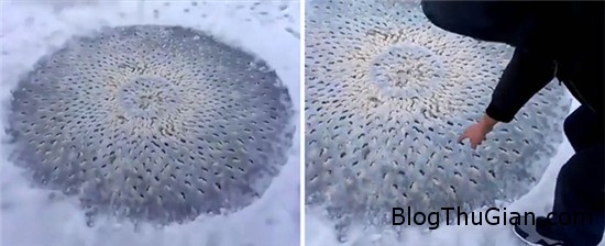 Những khối băng như những quả trứng màu đậm và nhạt đan xen nhau khác với băng xung quanh xuất hiện thành hình tròn giữa hồ nước đóng băng