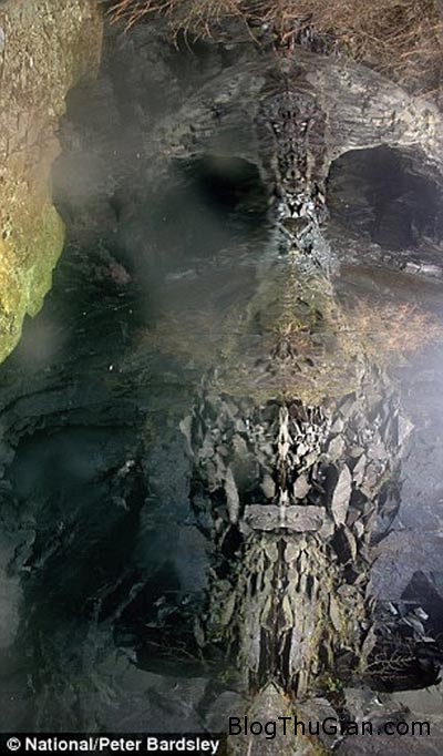 Sự đáng sợ của hình ảnh này chính là do những hòn đá in bóng xuống mặt hồ đã tạo nên một sự trùng hợp ngẫu nhiên. Nó khiến người ta liên tưởng tới một chiếc hộp sọ khổng lồ, đáng sợ, có hai con mắt trũng, mũi và những chiếc răng nanh khiếp đảm.