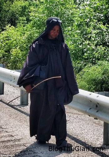 Một người phụ nữ bí ẩn trong trang phục đen và đội mũ che trùm đầu, mang theo bên mình một chiếc túi cũng màu đen và cầm theo một cây gậy đã khiến không ít người cảm thấy bối rối vì sự xuất hiện của cô trên đường.