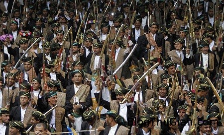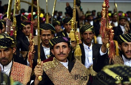 Những hình ảnh thú vị dưới đây cho thấy các chú rể người Yemen (một đất nước Ả Rập thuộc khu vực Tây Á) ăn vận trang phục truyền thống, mang gươm, cùng nhau xuất hiện tại một lễ cưới tập thể. Tuy lễ cưới có tới 2.000 chú rể tham gia nhưng không có lấy một cô dâu.