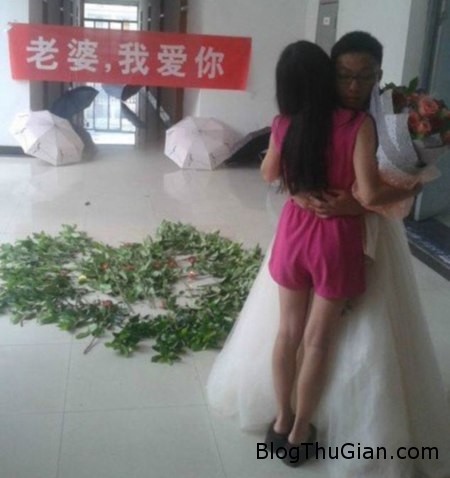 Chàng trai 23 tuổi cho rằng cô bạn gái Liang Sun sẽ không nghĩ anh có ý định nghiêm túc nếu chỉ đơn giản ngỏ lời tại trường đại học của họ ở thành phố Trùng Khánh, miền nam Trung Quốc. Vì thế Liu đã khoác lên mình chiếc váy cưới trắng tinh và thuê những người bán hoa đến trang trí thành hình trái tim với dòng chữ “Cô dâu của anh – Anh yêu em”.
