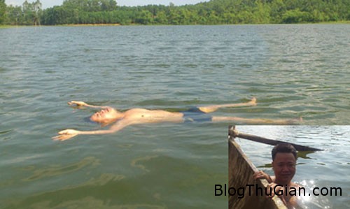 Anh Dũng đã cởi áo nhảy xuống, lặn một hơi rồi nổi lềnh bềnh trên mặt nước. Quả thực, “dị nhân” này không hề có bất kỳ một động tác khua nước để tạo lực nổi nào. Thỉnh thoảng mỏi chân, mỏi tay, anh lại co duỗi hoặc chắp tay lên ngực. Vậy mà hơn một giờ đồng hồ “khảo nghiệm”, người đàn ông này không hề bị nước nhấn chìm.