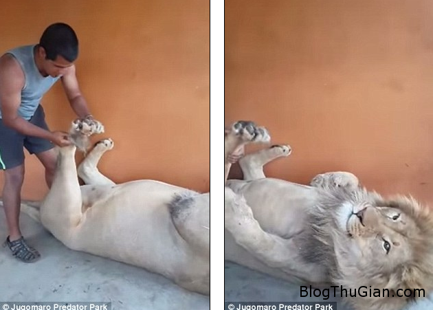 Người đàn ông không cần mặc đồ bảo hộ và chơi đùa rất thoải mái với con sư tử. Người đàn ông này thậm chí còn cù chân, massage con sư tử.