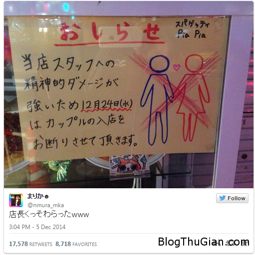 Trong nhiều năm qua, hình ảnh những cặp đôi yêu nhau luôn tay trong tay hẹn hò đã trở nên phổ biến trên khắp mọi miền thế giới Nhưng mới đây một nhà hàng ở Nhật Bản đặt bảng thông báo ” Tẩy chay ” các cặp tình nhân vào đêm Giáng Sinh đã gây không ích khó hiểu cho mọi người