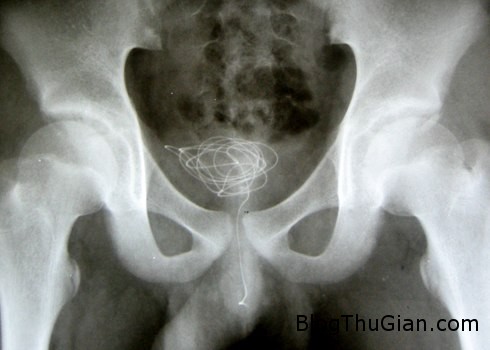 Trong lúc nghịch, bệnh nhân 15 tuổi đã nhét dây điện vào lỗ tiểu. Một phần dây điện lơ lửng ngoài niệu đạo, phần còn lại nằm trọn trong .