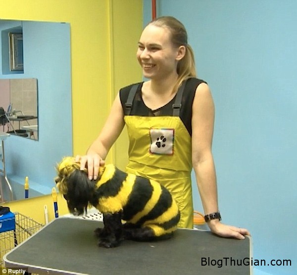 Một chú chó được nhuộm lông giống tạo hình con ong.
