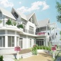 Phối cảnh 3D ngoại thất ngôi nhà tông trắng chủ đạo theo phong cách kiến trúc nông thôn kiểu Mỹ mái dốc hai chiều với họa tiết hoa văn được điều chỉnh cho hài hòa với lối kiến trúc