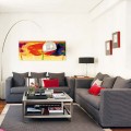 Bức tranh treo tường với ba màu đỏ, vàng, đen dù không có kích thước lớn nhưng vẫn đủ thu hút mắt nhìn. Chiếc ghế đệm màu hồng vân anh mang đến sự tương phản đầy bất ngờ, giúp