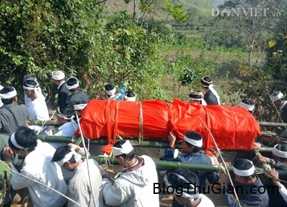 Ở đây bà con khi tiễn đưa người mất không có xe tang mà phải dùng bằng đòn luồng, sau đó buộc quan lên rồi khiêng qua các ngọn đồi chót vót.
