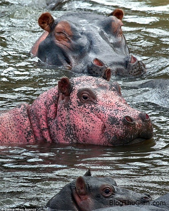 Chứng bệnh lạ khiến hà mã có da màu hồng nổi bật thu hút rất nhiều khách du lịch tới khu bảo tồn thiên nhiên Kenya.